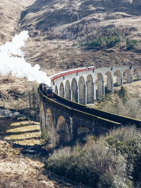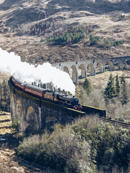 The Jacobite Steam Train is a scenic rail journey through the Scottish Highlands, running from Fort William to the coastal town of Mallaig. Along the way, it crosses the iconic Glenfinnan Viaduct and returns after time to explore Mallaig.
